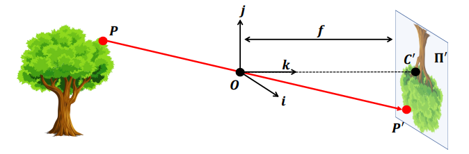 在这种结构中,胶片通常称为像或视网膜平面。光圈称为针孔 O 或相机中心。图像平面和针孔 O 之间的距离是焦距 f。有时,视网膜平面位于 O 和 3D 物体之间,与 O 的距离为 f。在这种情况下,它被称为虚拟图像或虚拟视网膜平面。模型满足公式: