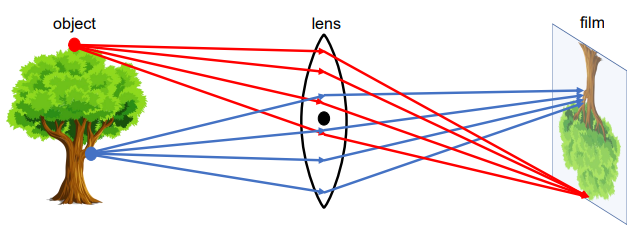 现代相机中一般都采用了多种透镜的组合代替以上的小孔。这些透镜通过某种组合仍然满足所有由同一点发出的光线最终都达到像平面上同一点。